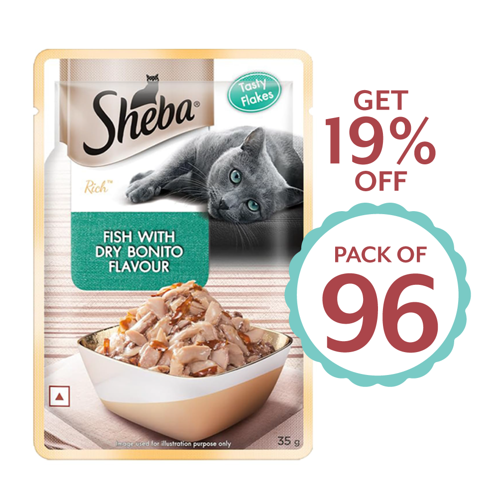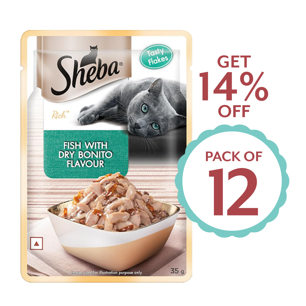 Sheba® Fish with Dry Bonito Flakes is premium food for your adult cat (+1 years). This protein in gravy recipe also contains essential vitamins and minerals, so this premium palate for your cat delivers a mouth-watering feast, without compromising on the goodness. Treat your furry friend to the satisfying taste of Sheba® Feast of Flakes wet cat food.