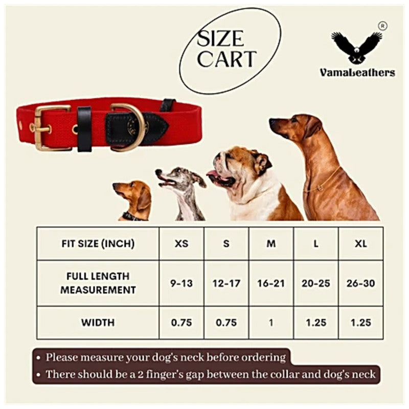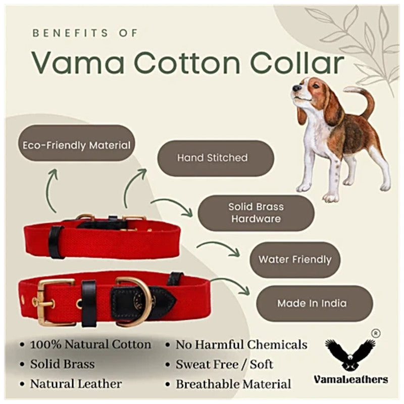 Hand-crafted Flat type Collar made from 100% Cotton Canvas with veg-tanned Leather trims in contrasting colours. Canvas Colours are long-lasting and do not bleed if wet. This product can be cleaned with water. All metal accessories are made of Solid Brass. Available in three sizes viz. Small, Medium & Large.