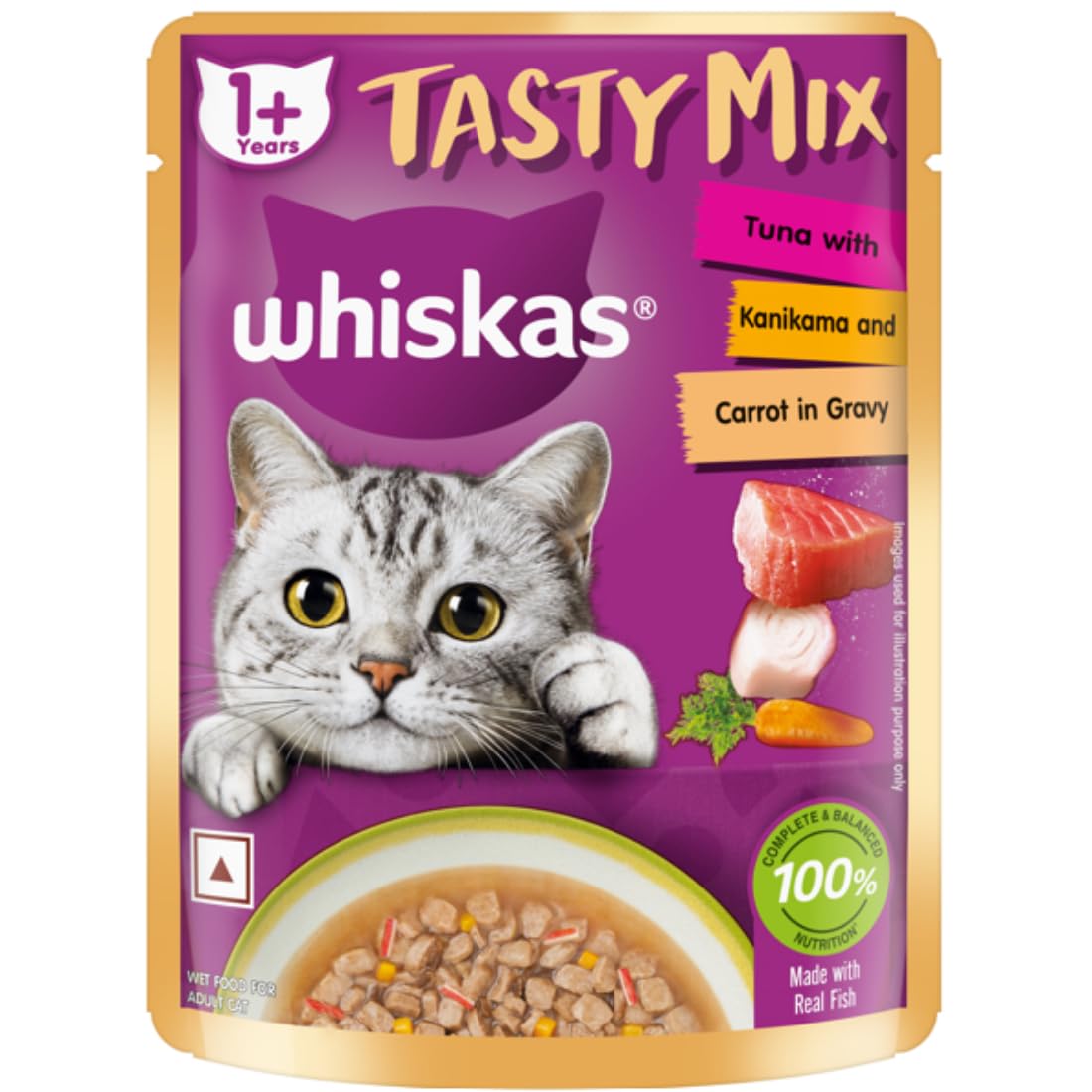 WHISKAS® Tuna, Kanikama & Carrot in Gravy is a complete and balanced wet cat food recipe that provides nourishment and makes mealtimes more exciting. It is made with real fish as well as nutritious vegetables, and includes all the enticing flavours that cats love. Besides being appetising and easy to digest, this wet meal contains Omega fatty acids to support healthy skin and coat as well as all the essential nutrients to support an adult cat’s health and energy requirements. WHISKAS® Tasty Mix also aids in hydration. It contains nutritious ingredients and has an appetising texture, aroma and flavour that appeals to the feline palate and attracts even fussy eaters for a fun and filling mealtime.
