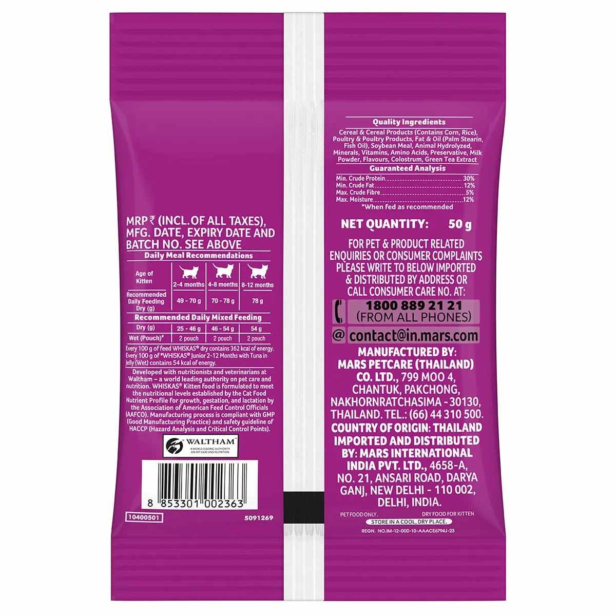 WHISKAS® Junior Ocean Fish Kitten Dry Food is a complete and balanced dry, kitten food recipe, rich in protein (for lean muscles) and calcium (for the development of strong bones). A broad range of added vitamins, minerals and antioxidants, strengthen the vitals, teeth, fur, skin, immunity and overall health of your pet kitten.